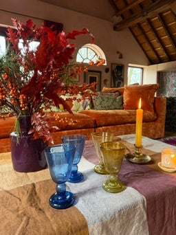 The Artisan Goblet is a mouth-blown glass available in three beautiful colors. Each glass is individually blown and therefore unique; no two glasses are alike. They're perfect for a glass of wine, but they also add a festive touch to your sparkling water.